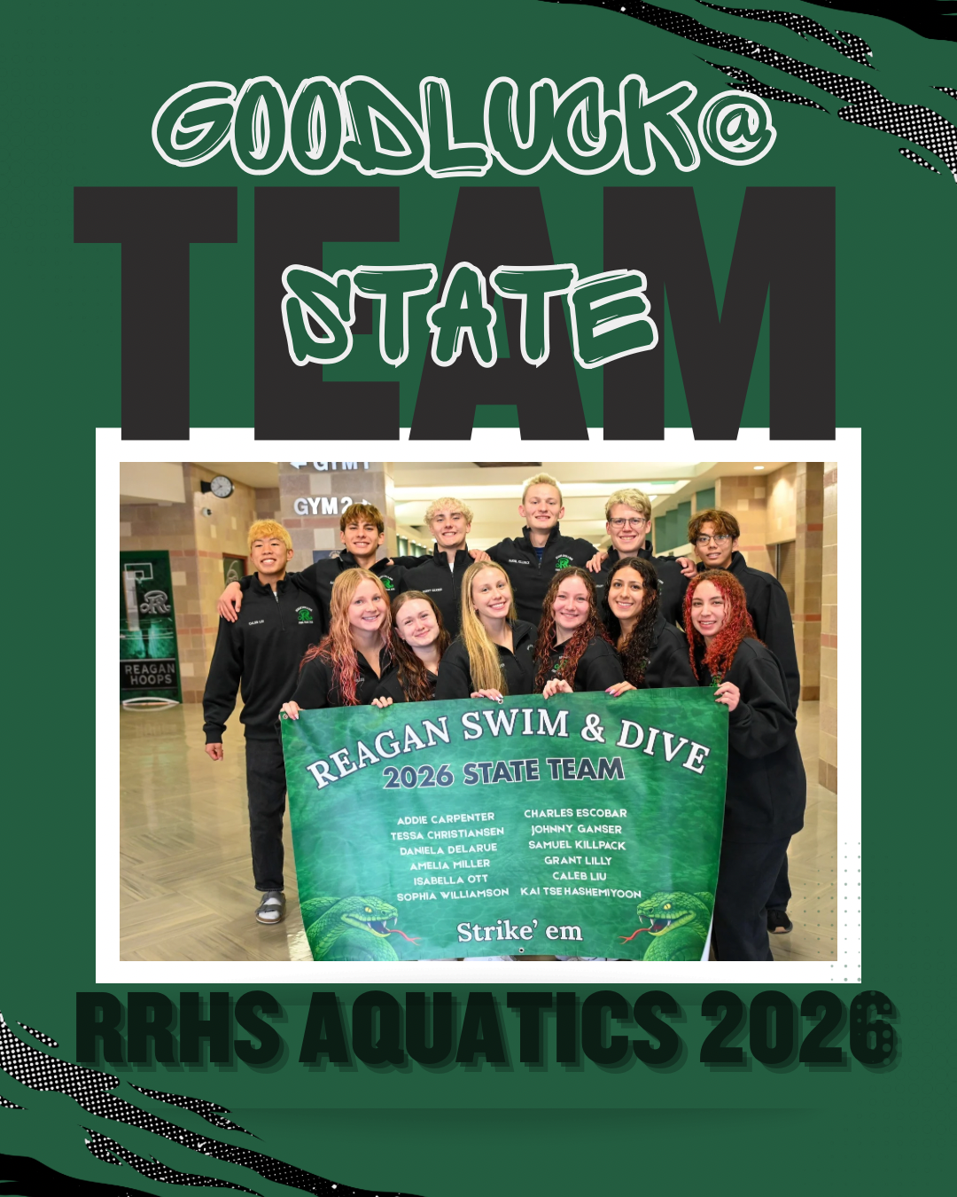 Led by Head Aquatics Coach Michael Rourke, the Reagan drumline, Varsity cheerleaders, students, and parents came together in an energetic show of support to send the team off to Austin in true Rattler style.